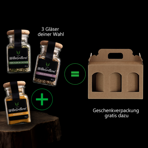 Wähle 3 Gewürzgläser deiner Wahl und lege sie gemeinsam mit einer leeren Geschenkverpackung in der Farbe Grün oder Beige in deinen Warenkorb. Die Verpackung gibt es gratis dazu – der Rabatt wird automatisch an der Kasse abgezogen.